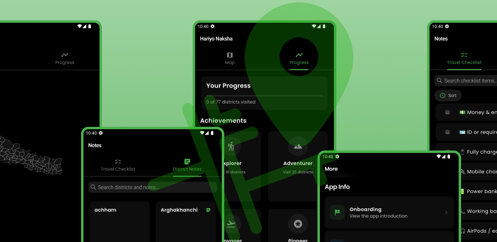Hariyo Naksha (“Green Map”) is an interactive Flutter app that helps users track their journeys across Nepal’s 77 districts. It features a modern dark UI, smooth animations, offline functionality, and high-quality exports for sharing progress.